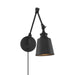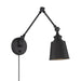 This 2-pack of adjustable sconces boasts convenient, fashionable illumination that is perfect for adding extra light and style in any room. For added convenience, these sconces can even be plugged in to any standard wall outlet, or you can hard-wire them. Matte Black finish. Adjustable height ranges from 17" to 26". 5.75" width. Wall extension ranges from 12" to 31". Backplate 5" diameter. Max 60 watt bulb, standard size A19 bulbs recommended. Bulb not included. Damp area rated. Set of 2 sconces.