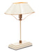 The Daphne Table Lamp looks as if it is made of one material in three distinctive finishes but the base is made of wood while the other elements on the ivory table lamp are made of wrought iron and brass in antique brass and gold finishes. The shape of the oval shade with its painted trim is a design detail worth noting.