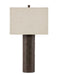 The Caravan Table Lamp has a cylindrical wrought iron body that could fool you into thinking It's made of rough-hewn wood but It's not: it's made of wrought iron. The rectangular natural linen shade that tops the dark brown lamp adds texture to its rustic vibe.