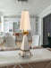 Highlighted by the unique gold leaf elements and a Patina Gold finish, this lovely table lamp adds a Whimsical elegance to your master suite or study. Complete the vignette by adding a stack of books, frames, and eye-catching candleholders. Striking a balance between shabby chic and Eclectic, this beauty is a 32 Inch tall table and accent lamp. The base is 6.5" square width and the gold leaf element at the top of the base brings a sophisticated appeal to this New Orleans Flambeau inspired lamp.