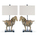 A Pair of Left and Right facing table lamps, add a touch of mid-century elegance to your space. Distressed detailing, antiqued glazing, and a rectangle oatmeal shade complete the vintage loo