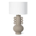 The primitive, vase-like, cast metal base of the Chandra Table Lamp is dappled with a paper mache-inspired finish. A lovely matte grey color, with natural brass neck and finial, the Chandra harkens to traditional craftsmanship, where the hand element is accentuated for its natural beauty. The Chandra vessel lamp is finished with a large drum shade in natural linen. Place the Chandra in a Boho-Chic bedroom or eclectic living space.