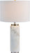 The stately design of this modern table lamp feels statuesque on tabletops throughout the home. A white marble lamp base adds the perfect element of antiquity without feeling old fashioned, thanks to a satin nickel-plated accents and off-white linen drum lampshade. Soft gray veining throughout the base makes this natural stone lamp is a graceful addition to grand interior spaces.