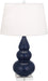 Our Triple Gourd collection features a simple but gracefully curving silhouette. Available in a wide array of vibrant colors and several different base finishes. - Midnight Blue Glazed Ceramic With Lucite Base Small Triple Gourd Accent Lamp With Pearl Dupioni Fabric Shade