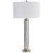 Contemporary In Style, This Cut Crystal Table Lamp Showcases Clean Lines, Accented With Lightly Antiqued Brass Plated Details. The Round Hardback Drum Shade Is A White Linen Fabric.