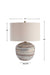 This Ceramic Accent Lamp Features A Striped Motif In Neutral Shades Of Brown, Taupe, Cream And Blue Accented By Light Brushed Brass Plated Details. A Light Beige Linen Drum Shade With Natural Slubbing Completes The Piece.