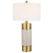 Sophisticated And Versatile, This Table Lamp Displays A Solid Iron Base Finished In Warm Brushed Brass With An Ivory Crackle Glazed Ceramic Center. The Hardback Drum Shade Is Covered In A White Cotton Fabric.