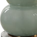 The Sanctuary Table Lamp Features A Curvy, Greenish-gray Glass Body Paired With A Fluted Style Neck That's Finished In A Plated Antique Brass, Displayed On An Elegant Crystal Foot. The Round Hardback Drum Shade Is Covered In A Crisp White Linen Fabric.