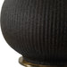 This Ceramic Table Lamp Features Heavily Ribbed Surface With Distressed Texture In A Matte Black Glaze With Rust Undertones. Accented By Plated Brushed Antique Brass Foot And Matching Hardware. The Slightly Tapered Round Hardback Shade Is A Warm Gray Linen Fabric With Natural Slubbing.