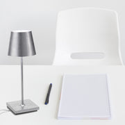 Battery-operated and rechargeable portable table lamp. The lamp features dimming touch control and has 3-CCT color temperature selection for 2200K (candle light), 2700K (warm white), and 3000K (cool white). The integrated LED module is designed and engineered to produce controlled downlight and a gentle uplight glow Features LED light with polycarbonate diffuser 9+ hours cordless illumination Touch dimmer control Indoor/outdoor use (powder-coated finishes) Rechargeable battery Contact charging base included 2-year warranty Specifications 188 lumens, 2700K LED/CRI>,80/120 volt/2.2w 3 color temperature settings: 2200K / 2700K / 3000K 4.3" sq. base x 11.8" height IP54 rating protection Die-cast aluminum body Powder-coated or metal-leaf finish Weight 3 lbs. Instructions To recharge your Poldina Pro Mini lamp, plug the provided charging base into an outlet and place the lamp on the base. The translucent top will glow red while charging and turn green once the charging cycle is complete. A full charge takes around 6 hours. The fully charged lamp may remain on the charging cradle without damaging the battery.