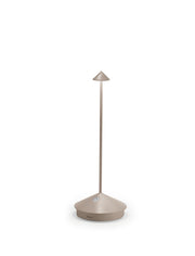 Pina Pro Battery-operated and rechargeable portable table lamp. The lamp features dimming touch control and has 3-CCT color temperature selection for 2200K (Candle light), 2700K (Warm White) and 3000K (Cool White). Features Die-cast LED lamp with polycarbonate diffuser 13+ hours cordless illumination Indoor/outdoor use Rechargeable and touch-dimmable Contact charging base with USB cable included 2-year warranty Specifications 185 lumens, CRI>,80/120 volt/2.2w 3 color temperature settings: 2200K / 2700K / 3000K 1.4in diameter head x 4.1in diameter base x 11.4in height IP54 rating protection Die-cast aluminum body Powder-coated finish Weight 2 lbs. Instructions To recharge your Pina Pro lamp, plug the provided charging base into an outlet and place the lamp on the base. The translucent top will glow red while charging and turn green once the charging cycle is complete. A full charge takes around 6 hours. The fully charged lamp may remain on the charging cradle without damaging the battery.