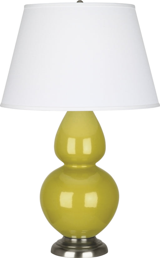 Citron Glazed Ceramic With Antique Silver Finished Accents Double Gourd Table Lamp With Pearl Dupioni Fabric Shade - Our Double Gourd collection fe...