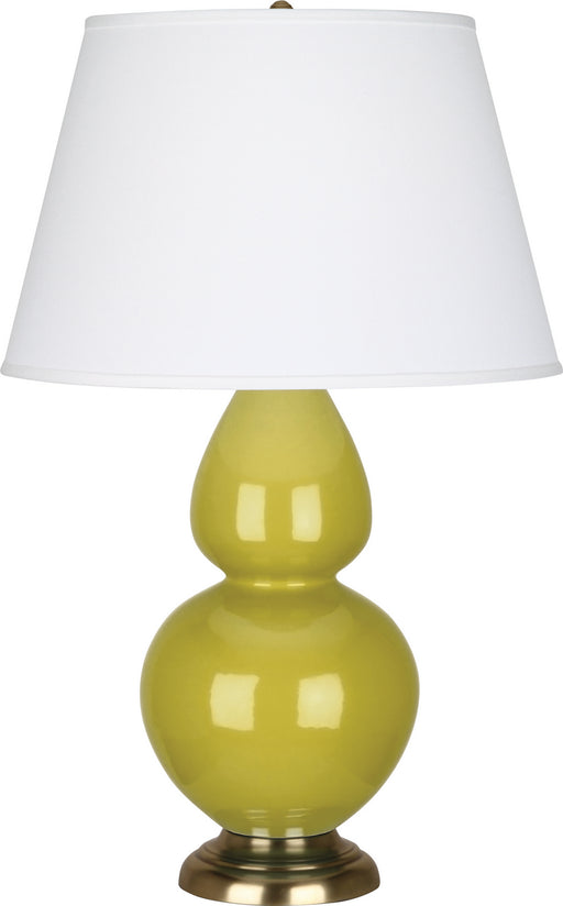 Citron Glazed Ceramic With Antique Brass Finished Accents Double Gourd Table Lamp With Pearl Dupioni Fabric Shade - Our Double Gourd collection fea...