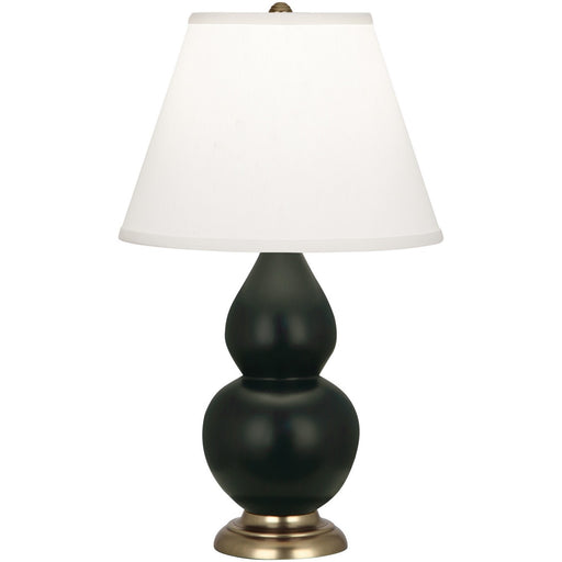 Matte Obsidian Glazed Ceramic With Antique Natural Brass Finished Accents Small Double Gourd Accent Lamp With Pearl Dupioni Fabric Shade - Our Doub...