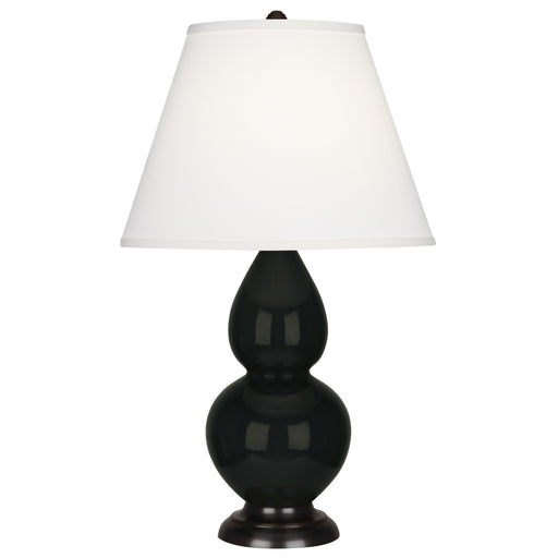 Matte Obsidian Glazed Ceramic With Deep Patina Bronze Finished Accents Small Double Gourd Accent Lamp With Pearl Dupioni Fabric Shade - Our Double ...