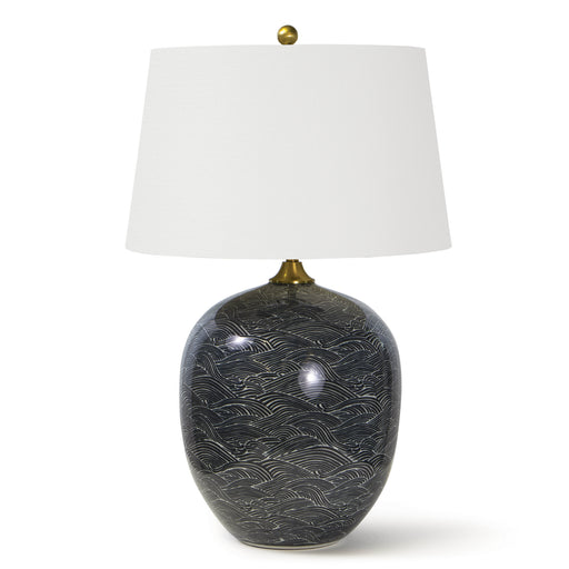 Ride the wave with this Japanese-inspired ceramic black-and-white table lamp. Its crisp natural linen shade and natural brass hardware perfectly ac...