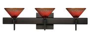 The Kona pendant features a wide cone-shaped glass, that demonstrates contemporary sensibilities. Our Sunset glass is a subtly prismatic pressed glass that features a translucent mix of deep red, which transitions to a lighter red from top to bottom. This dcor is energetic and can be used in various ways. When lit this gives off a light that is functional and vibrant. This glossy handcrafted glass uses a process where every glass is consistently produced using a press mold, keeping variations to a minimum. The vanity fixture is equipped with decorative lamp holders, removable finials, linear rectangular housing, and a removable low profile oval canopy cover. These stylish and functional luminaries are offered in a beautiful brushed Bronze finish.