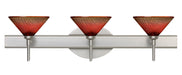 The Kona pendant features a wide cone-shaped glass, that demonstrates contemporary sensibilities. Our Sunset glass is a subtly prismatic pressed glass that features a translucent mix of deep red, which transitions to a lighter red from top to bottom. This dcor is energetic and can be used in various ways. When lit this gives off a light that is functional and vibrant. This glossy handcrafted glass uses a process where every glass is consistently produced using a press mold, keeping variations to a minimum. The vanity fixture is equipped with decorative lamp holders, removable finials, linear rectangular housing, and a removable low profile oval canopy cover. These stylish and functional luminaries are offered in a beautiful Satin Nickel finish.
