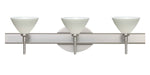 Domi has a classical bell shape that complements aesthetic, while also built for optimal illumination. Our Chalk glass is a soft white opal cased glass that is handcrafted with spiraling strokes of off-white color, emphasizing the subtle brush pattern. The silvery rippled design is subdued and harmonious. Unlit, it appears as simply a textured surface like spun silk, but when lit the texture comes alive. The smooth satin finish on the clear outer layer is a result of an extensive etching process, with the texture of the subtle brushing. This blown glass is handcrafted by a skilled artisan, utilizing century-old techniques passed down from generation to generation. The vanity fixture is equipped with decorative lamp holders, removable finials, linear rectangular housing, and a removable low profile oval canopy cover. These stylish and functional luminaries are offered in a beautiful Satin Nickel finish.