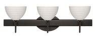 Brella has a classical bell shape that complements aesthetic, while also built for optimal illumination. Our Chalk glass is a soft white opal cased glass that is handcrafted with spiraling strokes of off-white color, emphasizing the subtle brush pattern. The silvery rippled design is subdued and harmonious. Unlit, it appears as simply a textured surface like spun silk, but when lit the texture comes alive. The smooth satin finish on the clear outer layer is a result of an extensive etching process, with the texture of the subtle brushing. This blown glass is handcrafted by a skilled artisan, utilizing century-old techniques passed down from generation to generation. The vanity fixture is equipped with decorative lamp holders, removable finials, linear rectangular housing, and a removable low profile oval canopy cover. These stylish and functional luminaries are offered in a beautiful brushed Bronze finish.