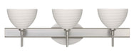 Brella has a classical bell shape that complements aesthetic, while also built for optimal illumination. Our Chalk glass is a soft white opal cased glass that is handcrafted with spiraling strokes of off-white color, emphasizing the subtle brush pattern. The silvery rippled design is subdued and harmonious. Unlit, it appears as simply a textured surface like spun silk, but when lit the texture comes alive. The smooth satin finish on the clear outer layer is a result of an extensive etching process, with the texture of the subtle brushing. This blown glass is handcrafted by a skilled artisan, utilizing century-old techniques passed down from generation to generation. The vanity fixture is equipped with decorative lamp holders, removable finials, linear rectangular housing, and a removable low profile oval canopy cover. These stylish and functional luminaries are offered in a beautiful Satin Nickel finish.