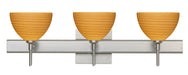 Brella has a classical bell shape that complements aesthetic, while also built for optimal illumination. Our Oak glass is a soft off-white cased glass that is handcrafted with spiraling strokes of light brown, emphasizing the subtle brush pattern. The wood-toned rippled design is subdued and harmonious. Unlit, it appears as simply a textured surface like wood grain, but when lit the texture comes alive. The smooth satin finish on the clear outer layer is a result of an extensive etching process, with the texture of the subtle brushing. This blown glass is handcrafted by a skilled artisan, utilizing century-old techniques passed down from generation to generation. The vanity fixture is equipped with decorative lamp holders, removable finials, linear rectangular housing, and a removable low profile oval canopy cover. These stylish and functional luminaries are offered in a beautiful Satin Nickel finish.