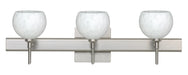 The Palla 5 features a diminutive orb-shaped glass, that complements any aesthetic. Our Carrera glass is a classic yet modern dcor that gives off a soft white light. Clear molten glass is rolled in alabaster powder like frit, and then blown into shape with a semi-clear frosted white inner finish. This dcor is created by rolling molten glass in small bits of white called frit. The smooth satin finish on the clear outer layer is a result of an extensive etching process. This blown glass is handcrafted by a skilled artisan, utilizing century-old techniques passed down from generation to generation. Each piece of this dcor has its own artistic nature that can be individually appreciated. The vanity fixture is equipped with decorative lamp holders, removable finials, linear rectangular housing, and a removable low profile oval canopy cover. These stylish and functional luminaries are offered in a beautiful Satin Nickel finish.