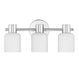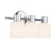 This Strand 3-light bath vanity light has a crisp, clean, modern look that is ideal for stylish homes. White glass shades ensure a comfortable and even glow. Chrome finish. Strand is 8" in height, 16.75" in width and extends 6.25" from the wall. It uses 3 standard size bulbs of up to 60 watts per bulb (bulbs not included).