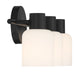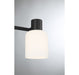 This Strand 3-light bath vanity light has a crisp, clean, modern look that is ideal for stylish homes. White glass shades ensure a comfortable and even glow. Matte black finish. Strand is 8" in height, 16.75" in width and extends 6.25" from the wall. It uses 3 standard size bulbs of up to 60 watts per bulb (bulbs not included).