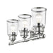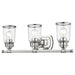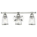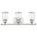 Our Lawrenceville collection features a retro industrial design, reminiscent of 19th century lighting. This three light bath vanity comes in a polished chrome finish and clear seeded glass.