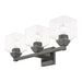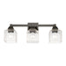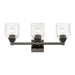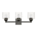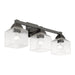 This vanity sconce is sure to provide reliable illumination without sacrificing style. It features three clear glass shades with an open bottom, exposing the bulbs inside. A polished black chrome finish covers the backplate and accents the light.