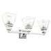 The Mission collection has clean lines with geometric forms. This three light bath vanity light features clear glass on polished chrome, square style arms that elevates the classic look.