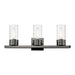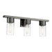 The Carson transitional three light vanity sconce will bring posh sophistication to your decor. The backplate and clear cylinder glass give this polished black chrome finish a sleek, contemporary look.