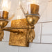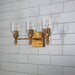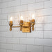 Drawing inspiration from a classic design, this antique gold 3-light vanity light is the perfect pick for any contemporary or traditional space. This Felice design showcases a simple, rectangular 5" square backplate, dome shaped glass shade, and a decorative unique flame-shaped gold finial. Easily installed over your mirror, this two-light sconce is suitable for damp spaces, and is finished in a beautiful antique gold