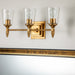 Inspired by 1950s and 60s design, the antique gold finish and double square backplate of our Vetiver 3-Light vanity light adds charming style to your bathroom space. The simple clear seeded glass, beautifully detailed finial, and the elegant torch-like shape complete the look of this new three-light bathroom lighting fixture.