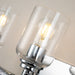 A contemporary design with a rustic appeal, this versatile vanity light adds a modern touch in a minimalistic way. Strong and sophisticated lines are softened with the hammered detail, and the clear, slightly curved cylinder glass gives off the perfect amount of light for beauty and function. With the length of 24 inches, this three light bath bar light is perfect for over-the-mirror installation, and is finished in polished chrome.