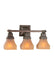 Enjoy the beauty and cozy Americana look with the simple curves and pure design that characterizes the Bungalow design movement. The three delicate Frosted Amber art glass shades are complemented with a warm Mahogany Bronze finished vanity fixture.