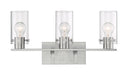 The Sommerset Brushed Nickel three-light vanity sconce features a clear glass shade enclosure with decorative thumb screws. The sleek, streamlined appearance of the Sommerset compliments both modern and transitional styles. Sommerset can also be at home in a coastal setting. 21 inches in width by 10.75 inches in height, the Sommerset is damp rated and is the perfect light source over the bathroom mirror, and can be positioned either up or down.