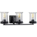 Immerse yourself in a home atmosphere primed for relaxation and inspired thinking with the beautiful craftsmanship of this bath light from the Winslett Collection. Savor this fresh take on a classic light choice as your gaze traces graceful arms and clean crisp lines coated in a beautiful black finish. Lightly seeded glass shades rest in shiny pedestal light bases that add an unexpected, but welcomed dash of modern personality to this clean, traditional design.