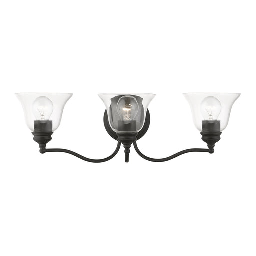 Bring a refined lighting style to your bath area with this Moreland collection three light vanity sconce. Shown in a black finish and clear glass.D...