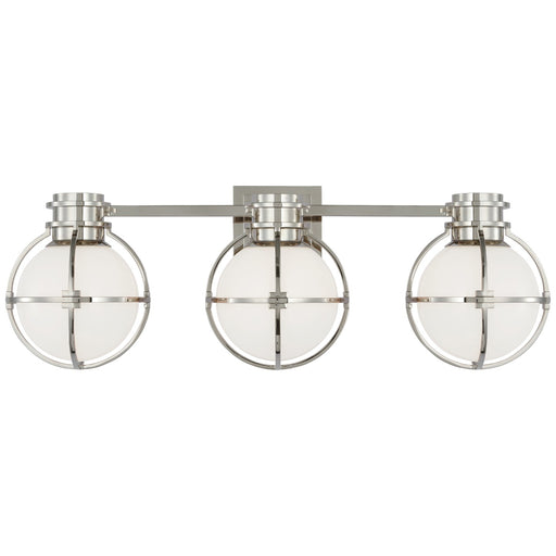 Details:Product Type: Three LightsFinish: Polished NickelShade: White GlassDesigner: Chapman & MyersMeasurements:Width / Dia: 24.25"Height: 8.5...