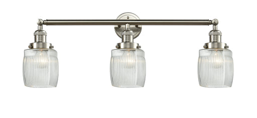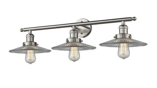 Colton - 3 Light - 32 inch - Brushed Satin Nickel - Clear Halophane Shade - Bath Vanity LightDetails:Product Type: Three LightsFinish: Brushed Sati...