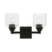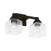 This bath vanity light is sure to provide reliable illumination without sacrificing style. It features two clear seeded glass shades with an open bottom, exposing the bulbs inside. A black finish covers the backplate and accents the light.