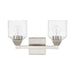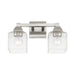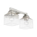This vanity sconce is sure to provide reliable illumination without sacrificing style. It features two clear glass shades with an open bottom, exposing the bulbs inside. A brushed nickel finish covers the backplate and accents the light.