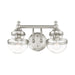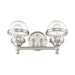 Sleek and simple lines define this beautiful brushed nickel finish two-light vanity sconce from the Oldwick collection. The clean, bold look of modernity blends with a raw industrial inspiration and hand blown clear glass give this design a versatile and eclectic look that works with nearly any style of home decor.