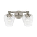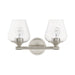 This two light vanity sconce from the willow collection has understated elegance. It features minimal details, clear curved glass with a brushed nickel finish and can fit into any decor.