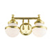 Sleek and simple lines define this beautiful polished brass finish two-light vanity sconce from the Oldwick collection. The clean, bold look of modernity blends with a raw industrial inspiration and hand blown satin opal white glass give this design a versatile and eclectic look that works with nearly any style of home decor.