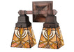 This Meyda Tiffany original two light wall sconce is inspired by the art and architecture of Charles Rennie Mackintosh and the Glasgow school of art. Amber Mauve and Gold stained glass make up the intricate patterned shade that is suspended from Mission style hardware in a warm Mahogany Bronze finish.