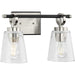 The Cassell Two-Light Vanity Fixture brings an enduring style to the bath. The light boasts a dual-tone finish of Brushed Nickel and Matte Black that accentuates its distinguished and handsome design. Tailored details smoothly blend linear precision with elegant circular rings and clear glass shades.