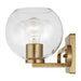 The Codyn two light vanity fixture in Satin Brass is a contemporary take on a classic mid-century design. Clear glass shades with open-ended spheres accent the elongated keyhole strap detail, for a clean look. This minimalist collection relies on subtle details to create visual interestââ¬â¹